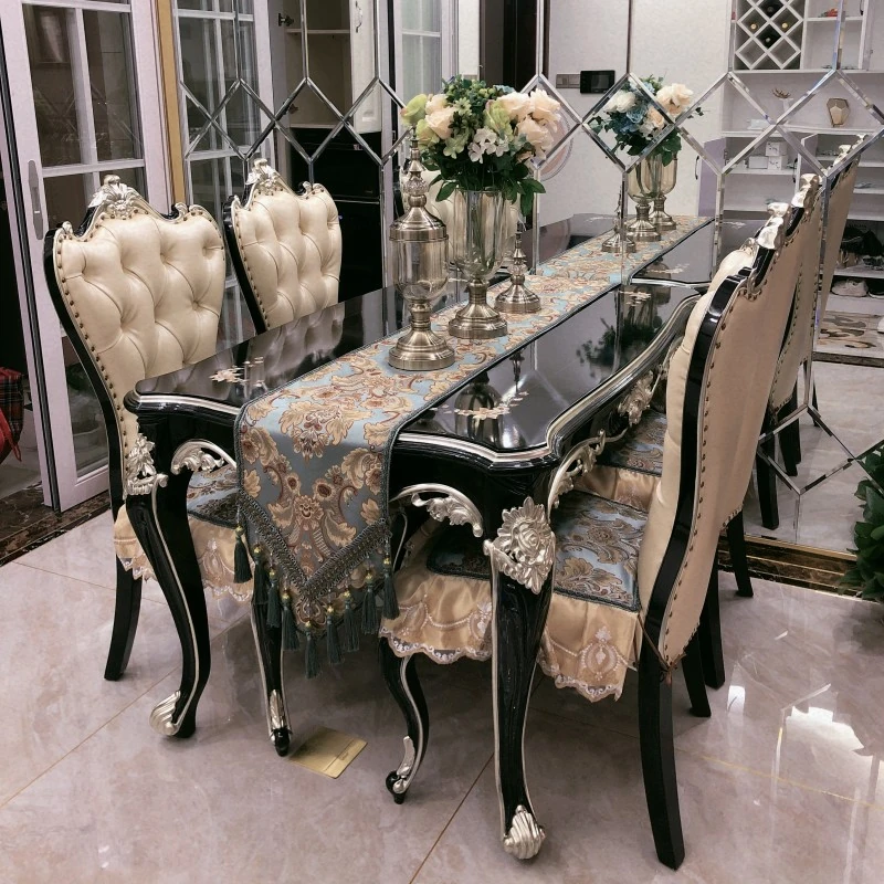 Elegant Black Solid Wood Dining Table Set for 6 - New Classical Rectangular Table with Exquisite French Carvings and Matching Chairs