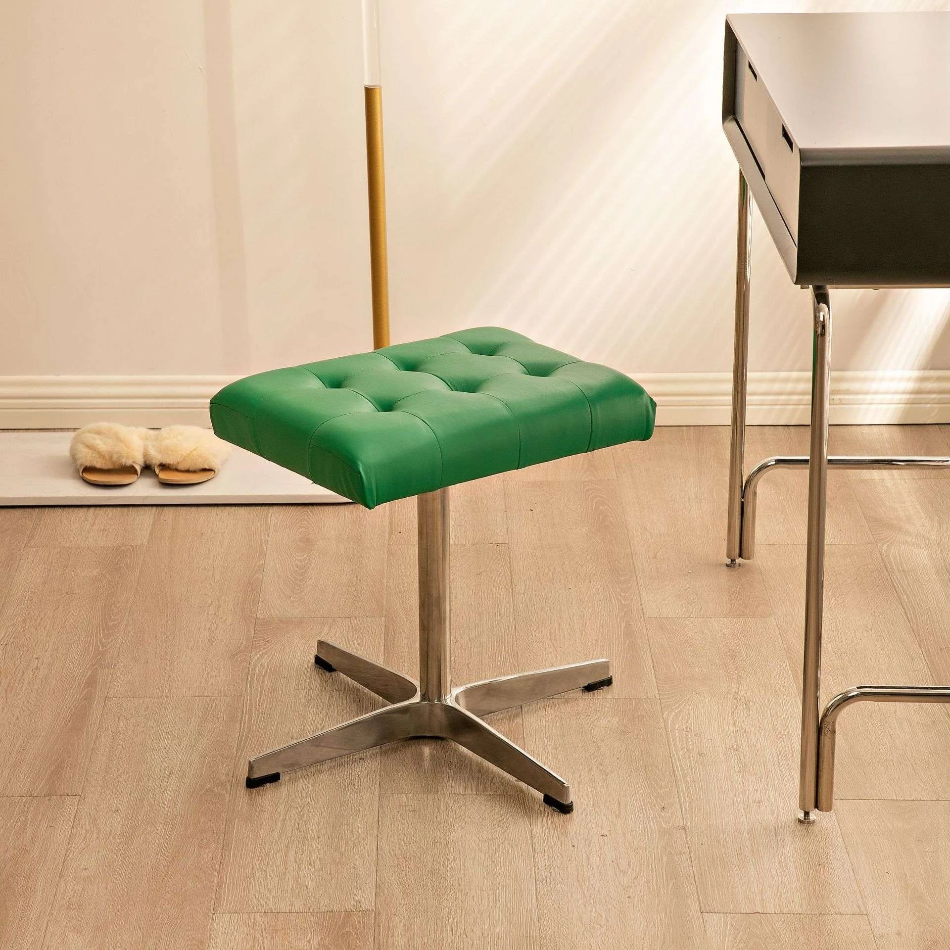 本革回転式化粧スツール|ミニマルでラグジュアリーなドレッサーチェア|全木製のシンプルデザイン|女性の寝室やネイルサロンに最適な美しいスツール
