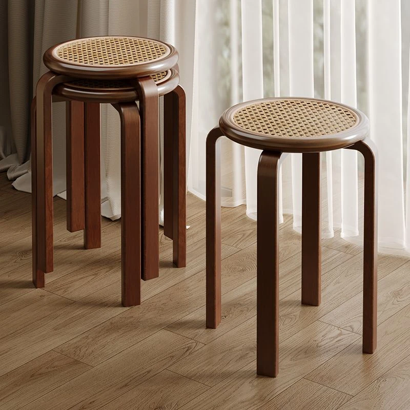 耐久性抜群の無垢材スツール!家庭用のコンパクトなデザインで、リビングやダイニングに最適。積み重ね可能で収納も簡単!おしゃれなラウンド型と創造的なラタン編みが魅力の多機能スツール。