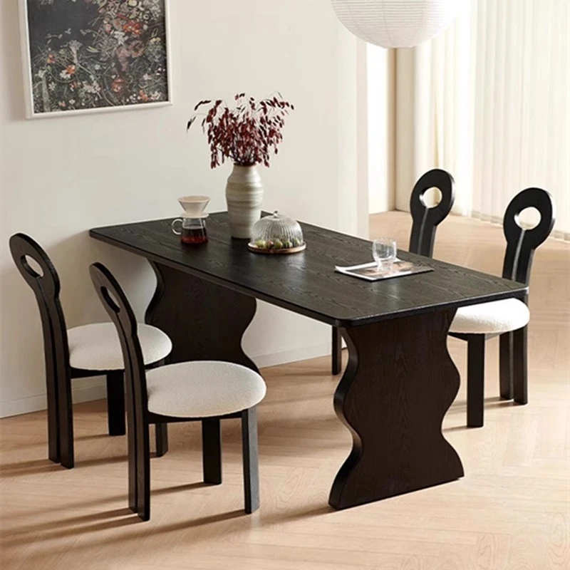 Elegant Vintage French Style Dining Table and Chairs Set - Dark Washed Solid Ash Wood with Wave Design for High-End Home Use in Living Room and Dining Room